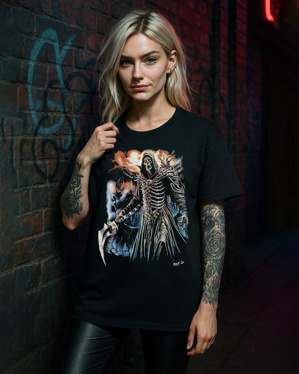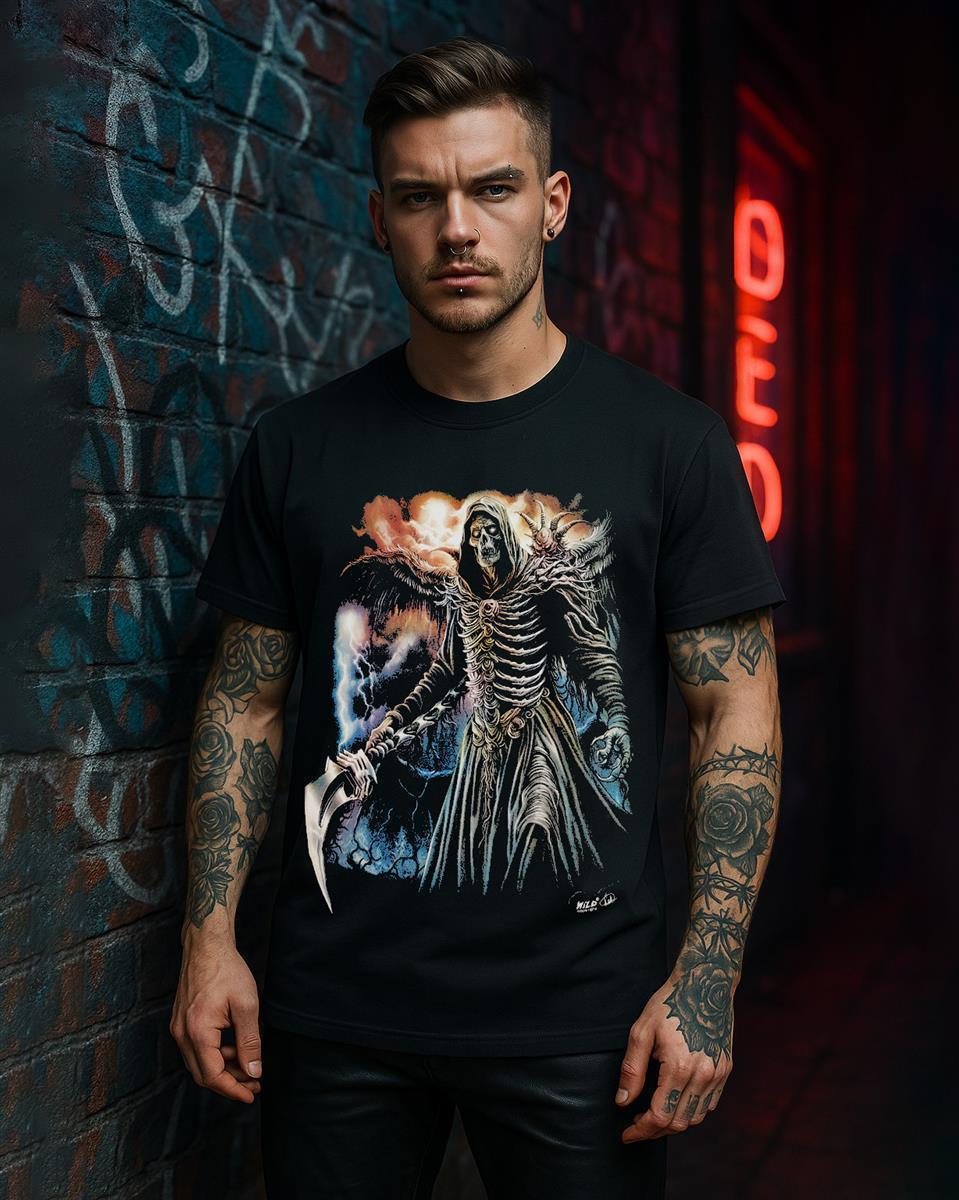 Bestelle noch heute unser wild leuchtendes T-Shirt mit gotisch inspiriertem Design und zeige deine Leidenschaft für alternative Mode, Tiere, Biker, Totenköpfe, Wölfe und den Sensenmann! Worauf wartest du? Sei mutig und definiere deinen eigenen Stil!
